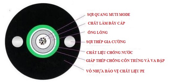 - Bên trong có ống lỏng chứa sợi quang đường kính 2.0mm chất liệu nhựa PBT đặc chủng, trong ống lỏng có các chất điền đầy, tạo cho sợi quang được linh hoạt trong ống, không làm hỏng và xước sợi quang, giúp cho tín hiệu được truyền đi tốt nhất