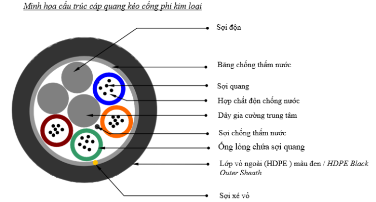 | 4 | Chất điền đầy-Filling compound | Thixotropic Jelly Compound. Chất điền đầy phải không gây độc hại, không gây ảnh hưởng đến các thành phần khác trong cáp cũng như màu của sợi, không b nấm