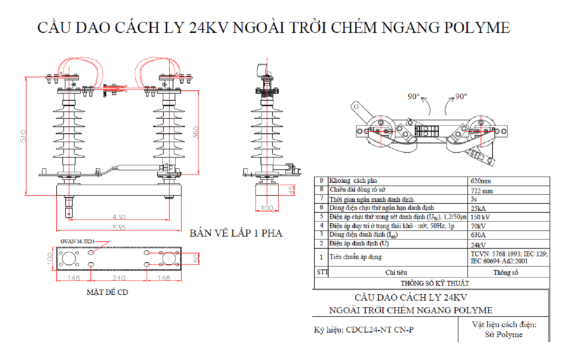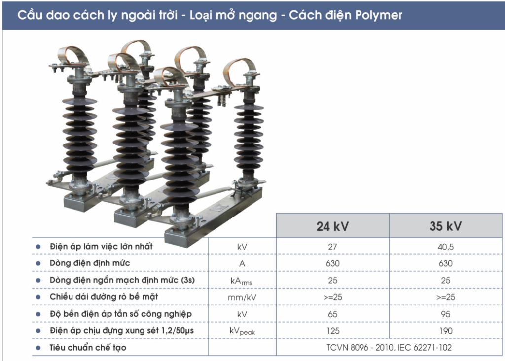 Cầu dao cách ly ngoài trời mở ngang – 24kV-35kV cách điện Polymer
