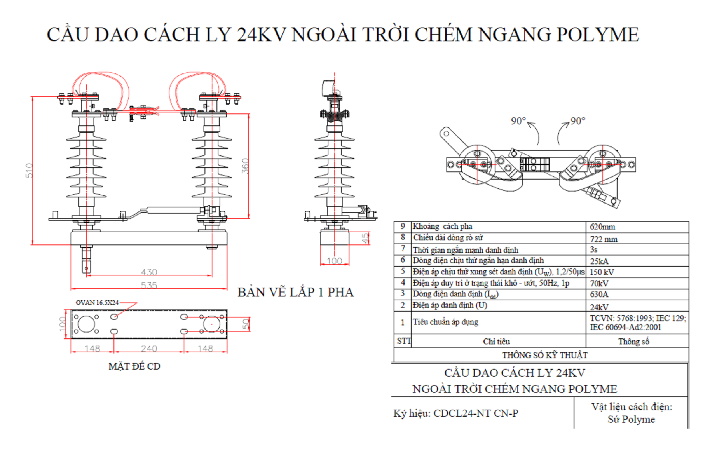 Cầu dao cách ly ngoài trời, chém ngang – 24kV-35kV cách điện Polymer