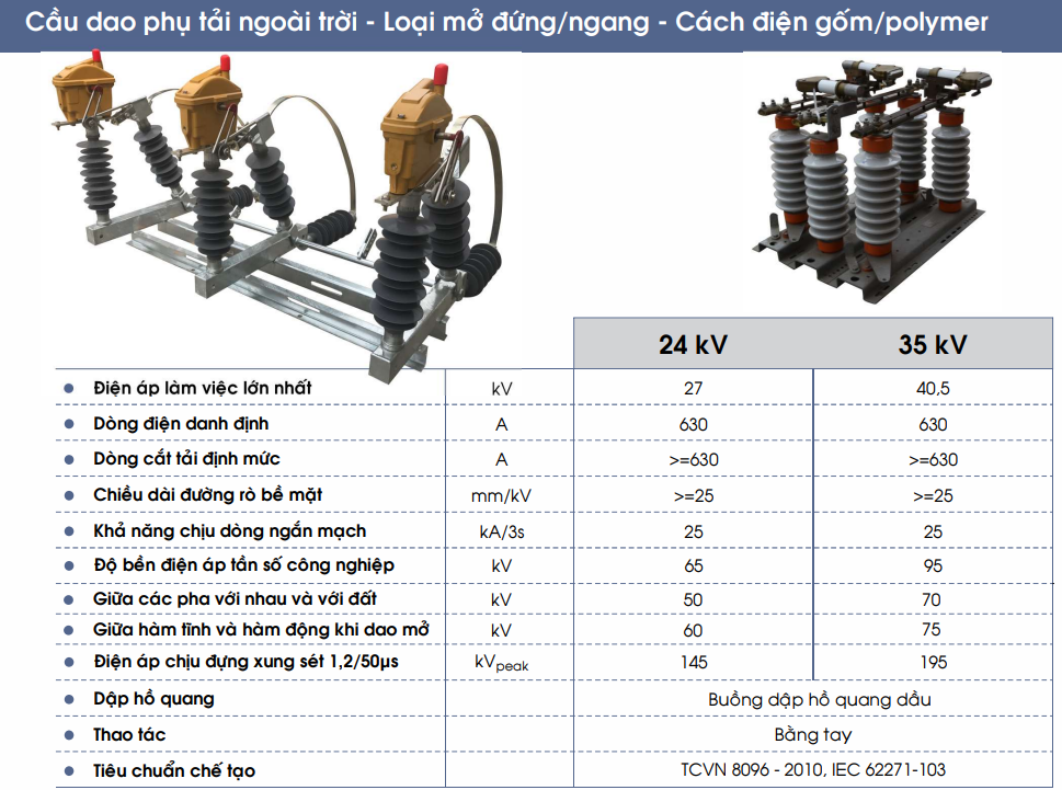 Cầu dao phụ tải ngoài trời, chém đứng/ngang – 24-35kV, cách điện Gốm/Polymer
