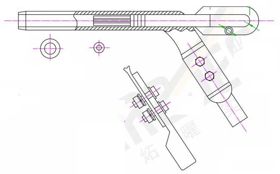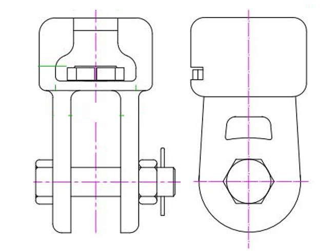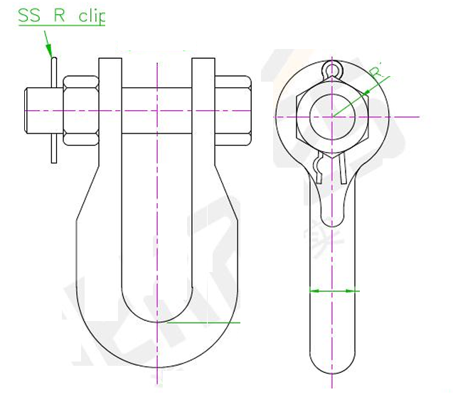 1- Móc treo chữ U, hay còn gọi là CK, chất liệu bằng thép cường lực được mạ kẽm nhúng nóng, có lực kéo >= 120kN, tác dụng cố định vào gông trên cột thép, giữ cho chuỗi néo không bị rơi