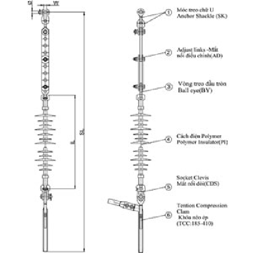 2- Khớp nối trung gian, chuyển hướng: chất liệu thép, mạ nhúng nóng, lực tải trọng phá hủy của chi tiết >= 70kN, dùng kết nối CK và chuỗi cách điện