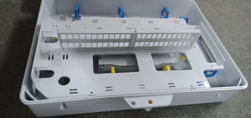 Mặt sau của tấm panel cũng có các vị trí lô quấn dự phòng cho dây quang, ngoài ra còn có các vị trí lắp các ống co nhiệt sau khi hàn sợi quang xong.