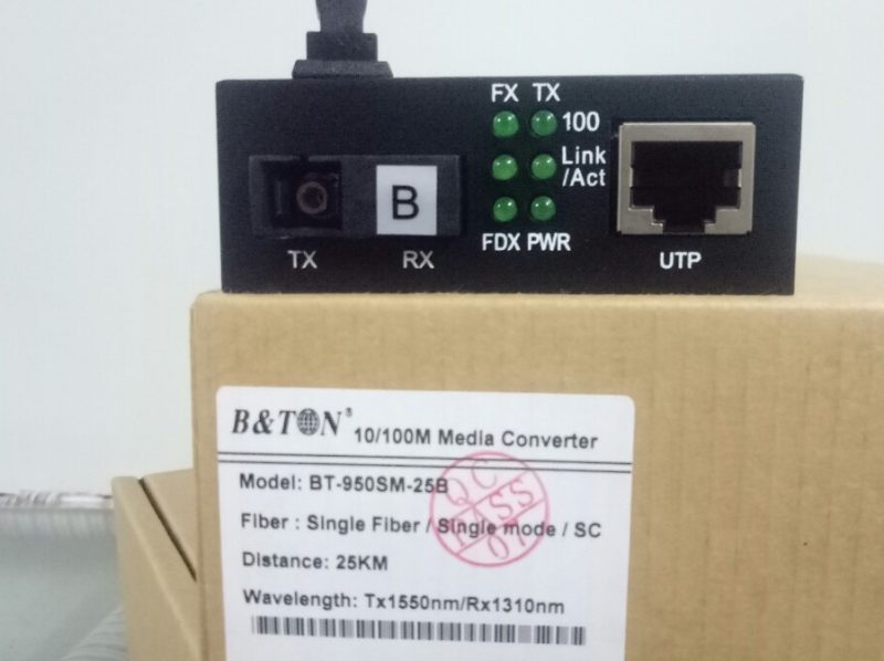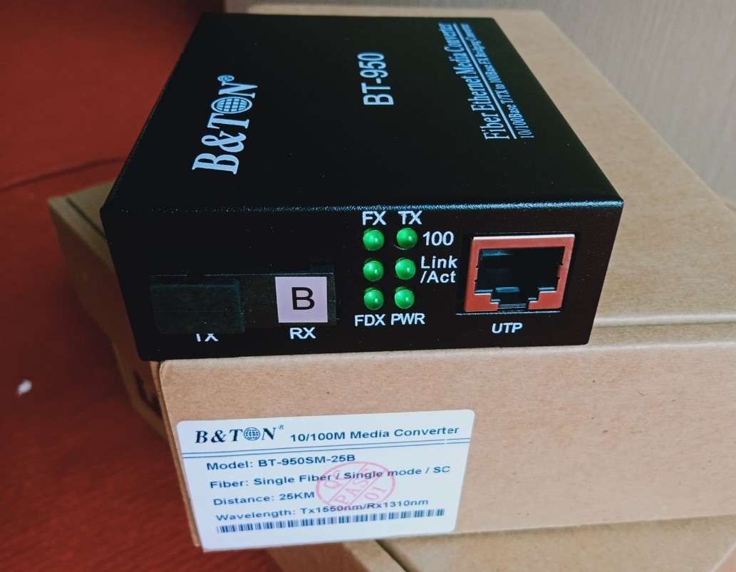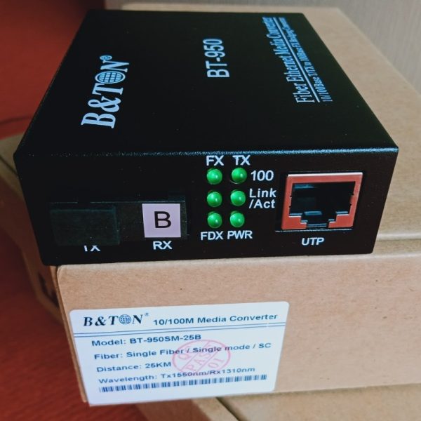 Part Number Optic Fiber Wavelength Power Rx Sensitivity Reach Loss Allowed BT-950SM-25B Single mode, simplex Tx1550/Rx1310nm -8~-3db -33db 25km 25db Thông số kỹ thuật của Bộ chuyển đổi quang điện B&TON BT-950SM-25B 1 sợi quang single mode10/100M, khoảng cách 25km -Tx1550/Rx1310nm