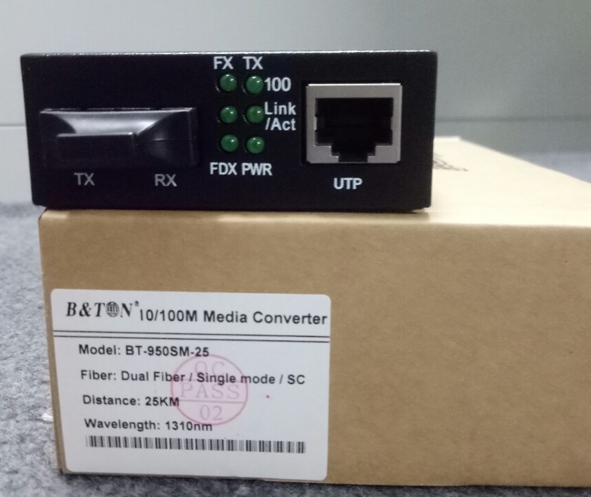 - Bộ chuyển đổi quang điện BT-950SM-25 truyền tải dữ liệu trên 2 sợi quang, loại converter quang 2 sợi này phải đẩy 2 bước sóng ánh sáng riêng biệt trong 2 sợi cáp quang. Thông thường bộ chuyển đổi quang điện media converter 2 sợi sử dụng bước sóng 1310 truyền trên cáp quang single mode. Thông số kỹ thuật của Bộ chuyển đổi quang điện B&TON BT-950SM-25 loại 10/100M, khoảng cách 25km
