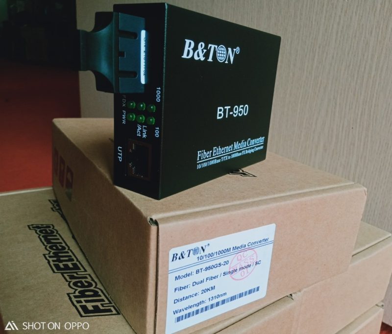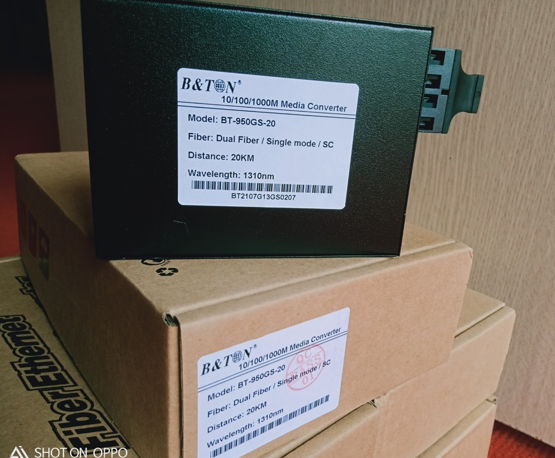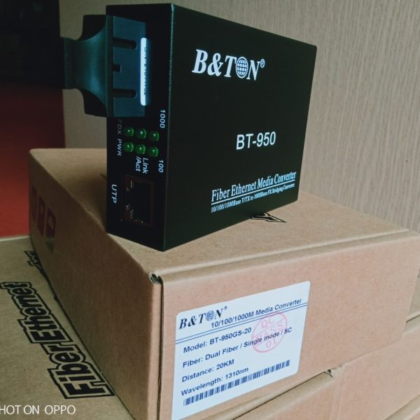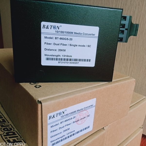 - Bộ chuyển đổi quang điện BT-950GS-20 Single mode 10/100/1000M khoảng cách 20Km, 2 sợi quang là bộ chuyển đổi quang điện Media Converter 10/100/1000 Base-Tx, Single mode cho khoảng cách truyền 20km, tối ưu chi phí cho những dự án lớn mà dây cáp đồng trục thông thường không thể đi xa. Sản phẩm bảo hành 12 tháng (1 đổi 1). Adaptor bảo hành 03 tháng. Bộ converter 2 sợi quang BT-950GS-20 cho 2 sợi sử dụng 2 sợi quang để truyền tải tín hiệu, tức là nó sẽ download và vừa upload trên sợi quang riêng biệt. Đây là điểm khác nhau với loại sử dụng 1 sợi quang để truyền tín hiệu