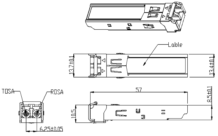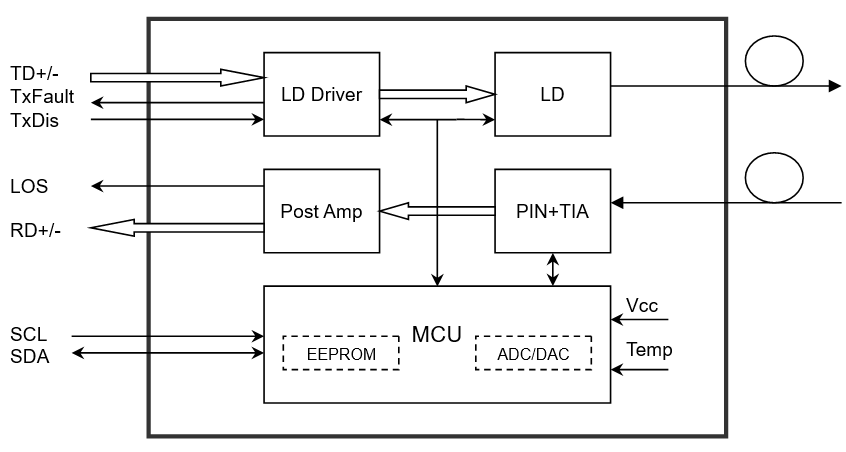 The transceiver consists of three sections: a FP laser transmitter, a PIN photodiode integrated with a trans-impedance preamplifier (TIA) and MCU control unit. All modules satisfy class I laser safety requirements.