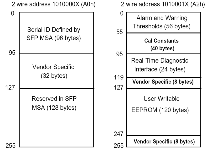 The diagnostic information with internal calibration or external calibration all are implemented, including received power monitoring, transmitted power monitoring, bias current monitoring, supply voltage monitoring and temperature monitoring. The digital diagnostic memory map specific data field defines as following.