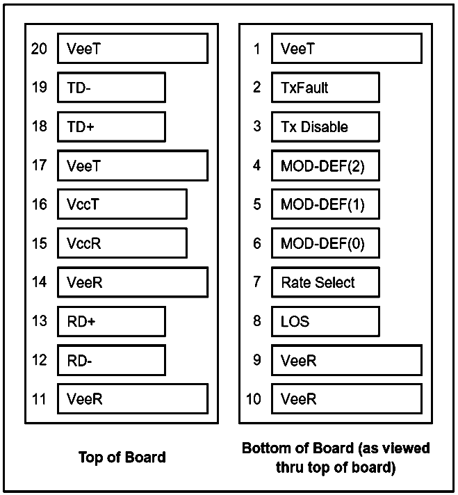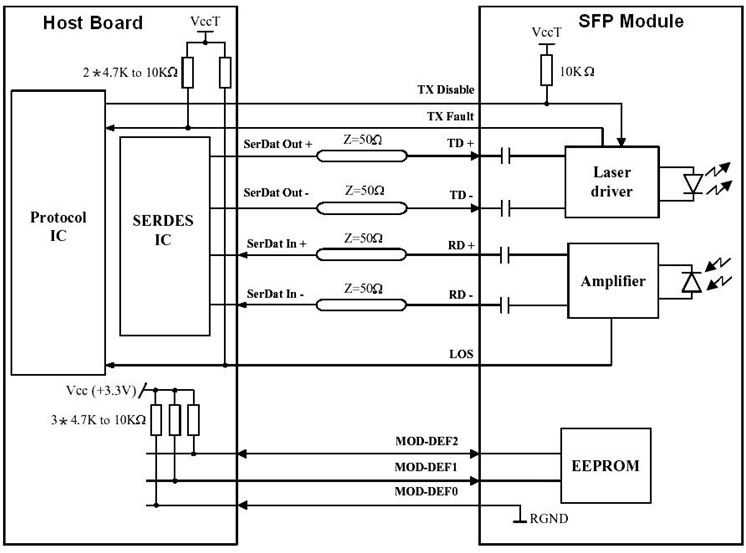 3) Mod-Def 0,1,2. These are the module definition pins. They should be pulled up with a 4.7k~10kΩ resistor on the host board. The pull-up voltage shall be VccT or VccR.
