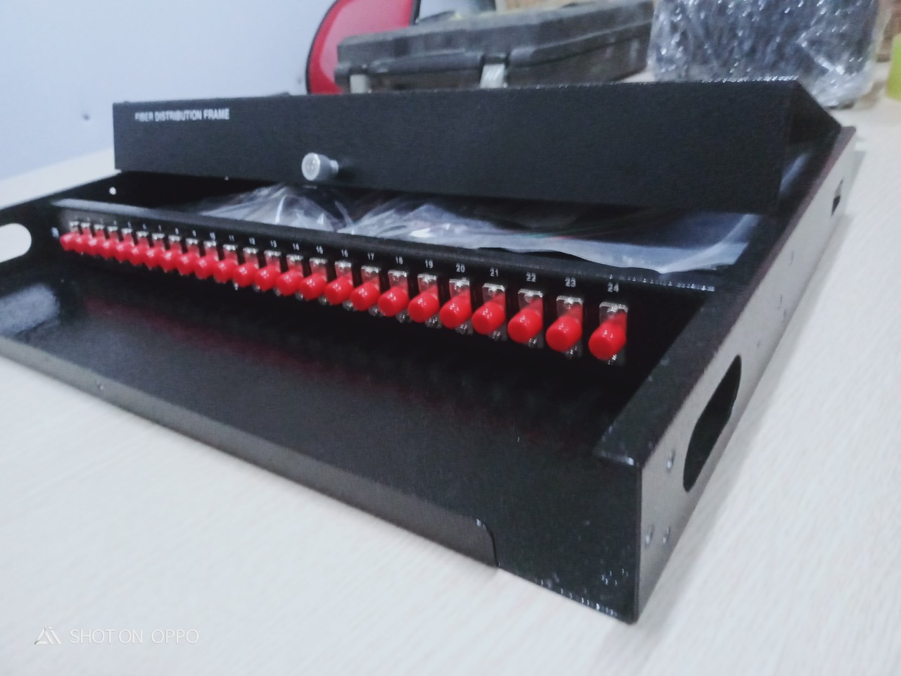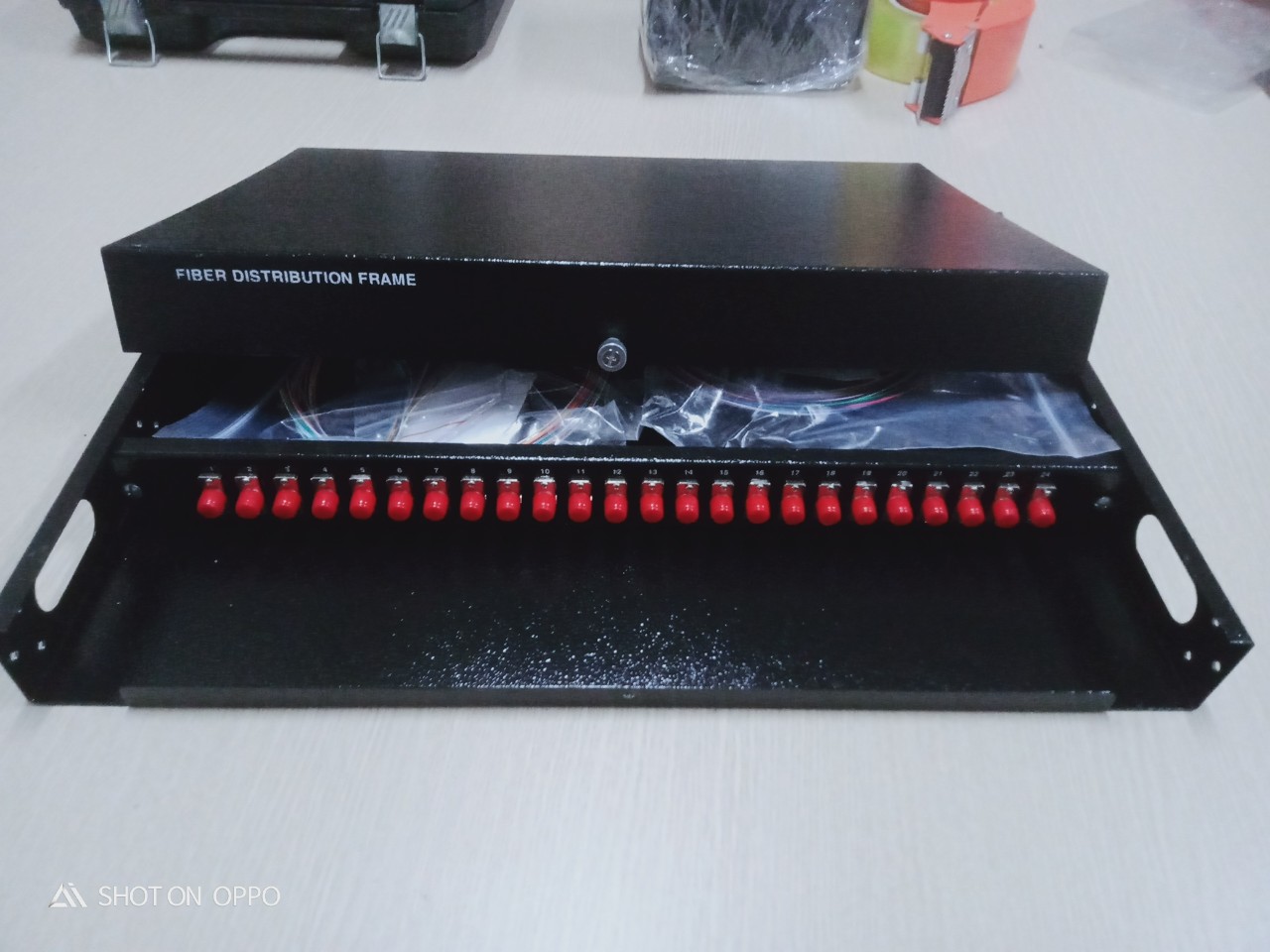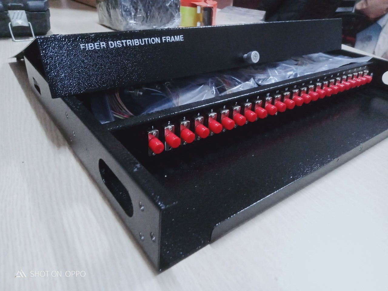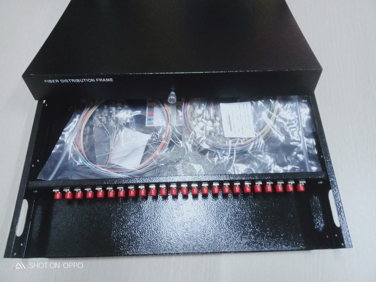 ODF được trang bị đầy đủ phụ kiện adapter, khay chứa mối hàn quang, ống co nhiệt, dây nối quang, theo dung lượng lắp đặt đồng bộ. ODF được trang bị đồng bộ adapter và dây nối FC/UPC hoặc FC/UPC, đường kính sợi 0.9mm, dài 1.5m, sử dụng sợi single mode.