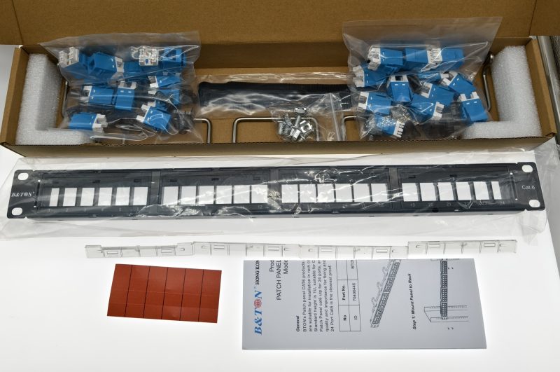 Patch Panel 24 port Cat6 bao gồm 1 thanh chính Patch Panel 24 cổng để cắm nhân mạng RJ45- cat6, 1 túi nhân mạng RJ45 cho cat6 (24 cái) sử dụng tool nhấn mạng khi bắt và kèm theo đó chính là một dây đeo quản lý cáp. Thanh nâng đỡ cáp mạng. Dây thít bó cáp mạng, nắp đựng thông tin các cổng. Ốc bắt cố định trên giá thanh 19’’. Thanh quản lý Patch Panel Cat6 24 Port được làm từ chất liệu tôn dày dặn nên rất chắc chắn, chúng được phủ bằng sơn tĩnh điện màu đen chống han rỉ rất hiệu quả.