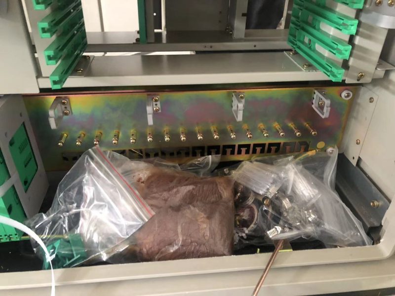 - Cáp vào được cố định bằng các chốt dươi đấy tủ, đảm bảo cáp được chắc chắn và ổn định khi sử dụng khai thác, các đường cáp quang, sợi dây nhảy, dây nối được bó vào các lẫy bó cáp gọn gàng, các khe cài khay ngăn nắp sắp xếp theo tứ tự